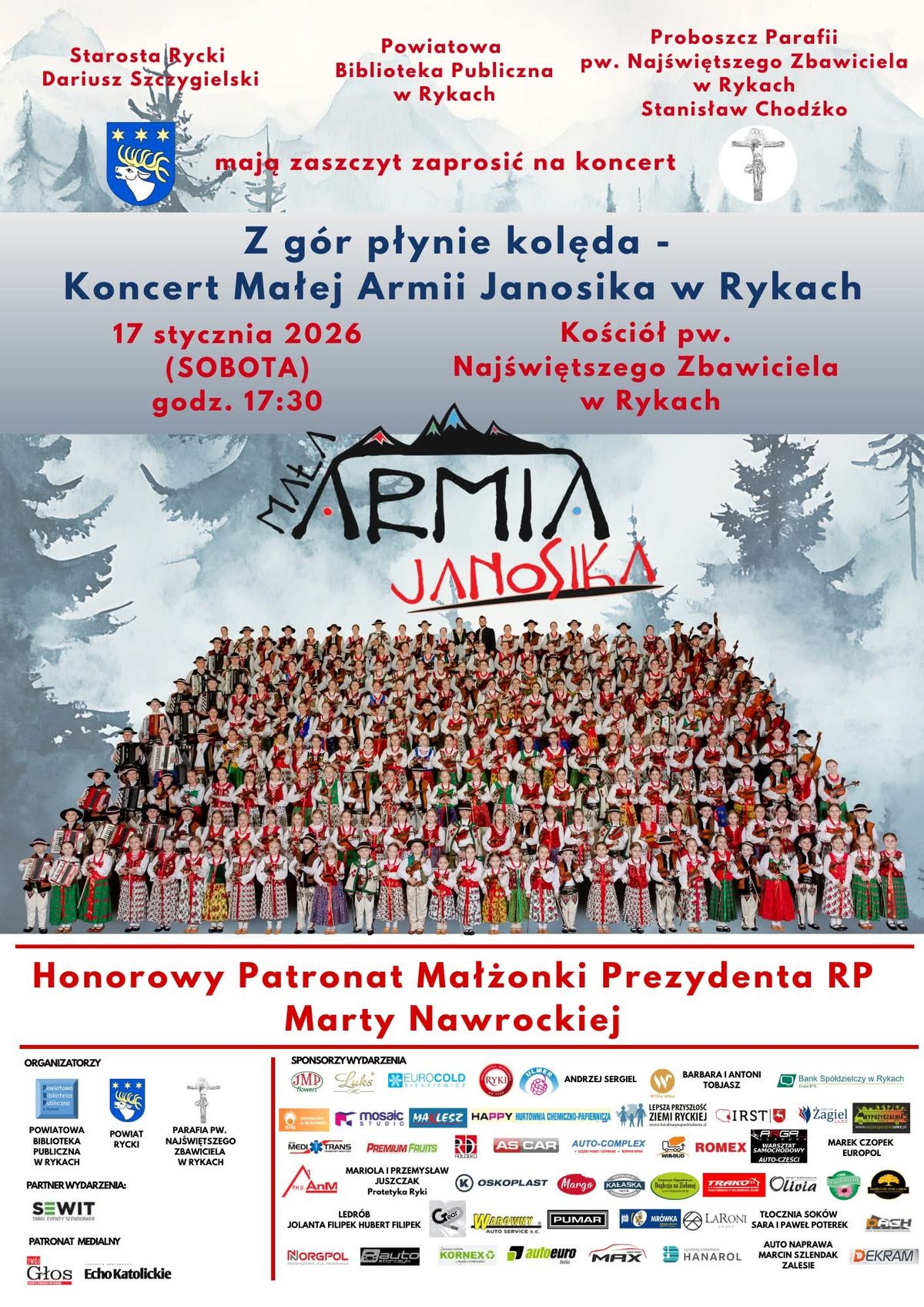 W sobotę, 17 stycznia Ryki staną się miejscem wyjątkowego wydarzenia muzycznego. W kościele parafialnym odbędzie się koncert Małej Armii Janosika – największej góralskiej kapeli w Polsce. Wydarzenie objęte jest honorowym patronatem Pierwszej Damy Rzeczypospolitej Polskiej.