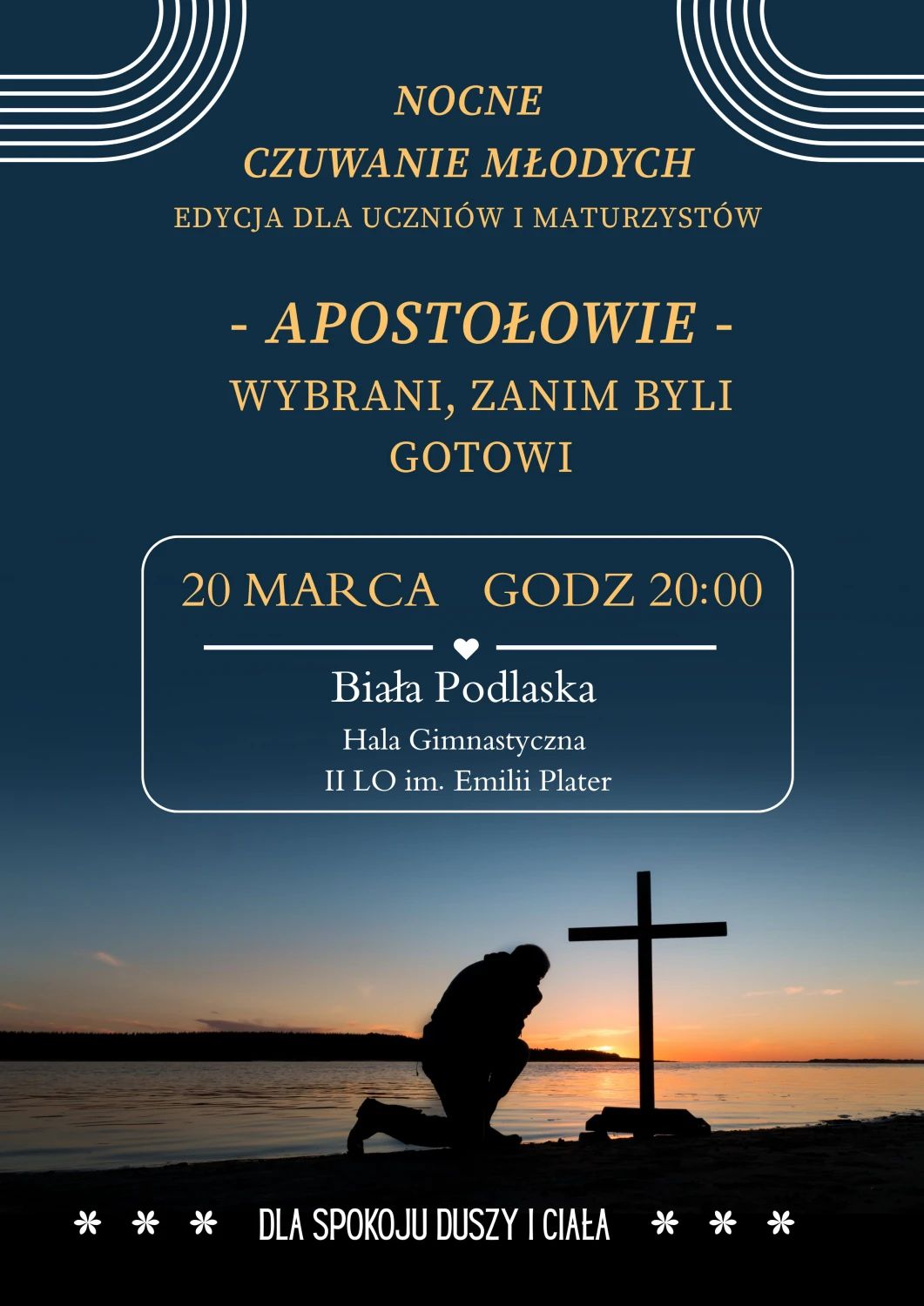 W Białej Podlaskiej odbędzie się Nocne Czuwanie Młodych – wydarzenie skierowane przede wszystkim do uczniów szkół średnich, w tym maturzystów. Spotkanie odbędzie się w piątek, 20 marca o godzinie 20:00 w hali sportowej II Liceum Ogólnokształcącego im. Emilii Plater w Białej Podlaskiej.