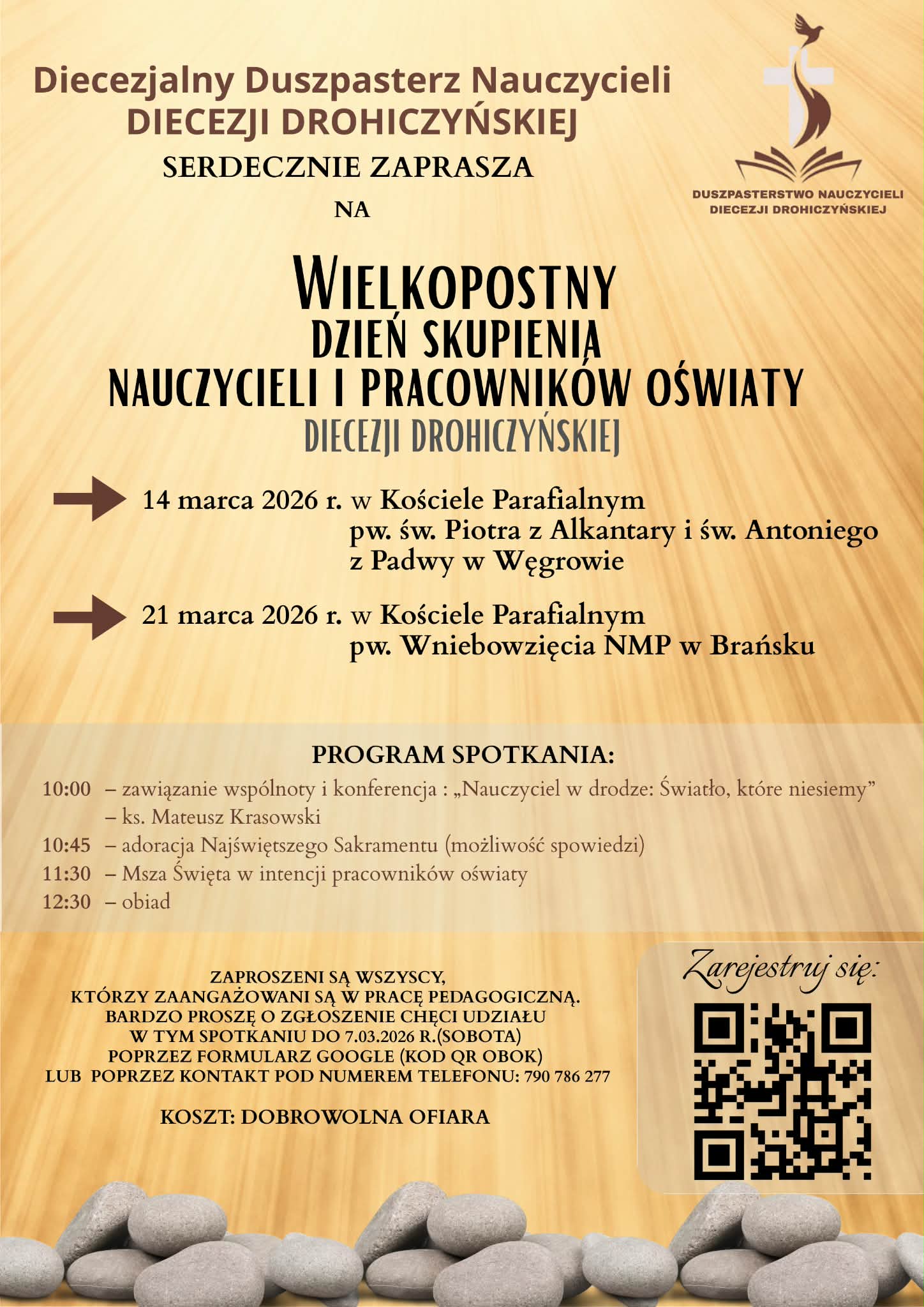 W sobotę, 14 marca spotkanie odbędzie się w parafii św. Piotra z Alkantary i św. Antoniego z Padwy w Węgrowie. Dla osób z północno-wschodniej część diecezji podobne wydarzenie zostanie zorganizowane 21 marca w parafii Wniebowzięcia NMP w Brańsku.Początek spotkania o godz. 10:00. W programie przewidziana jest konferencja duszpasterza nauczycieli: „Nauczyciel w drodze: Światło, które niesiemy”, adoracja Najświętszego Sakramentu oraz Msza Święta w intencji pracowników oświaty. Spotkanie zakończy się obiadem około godz. 12:30.