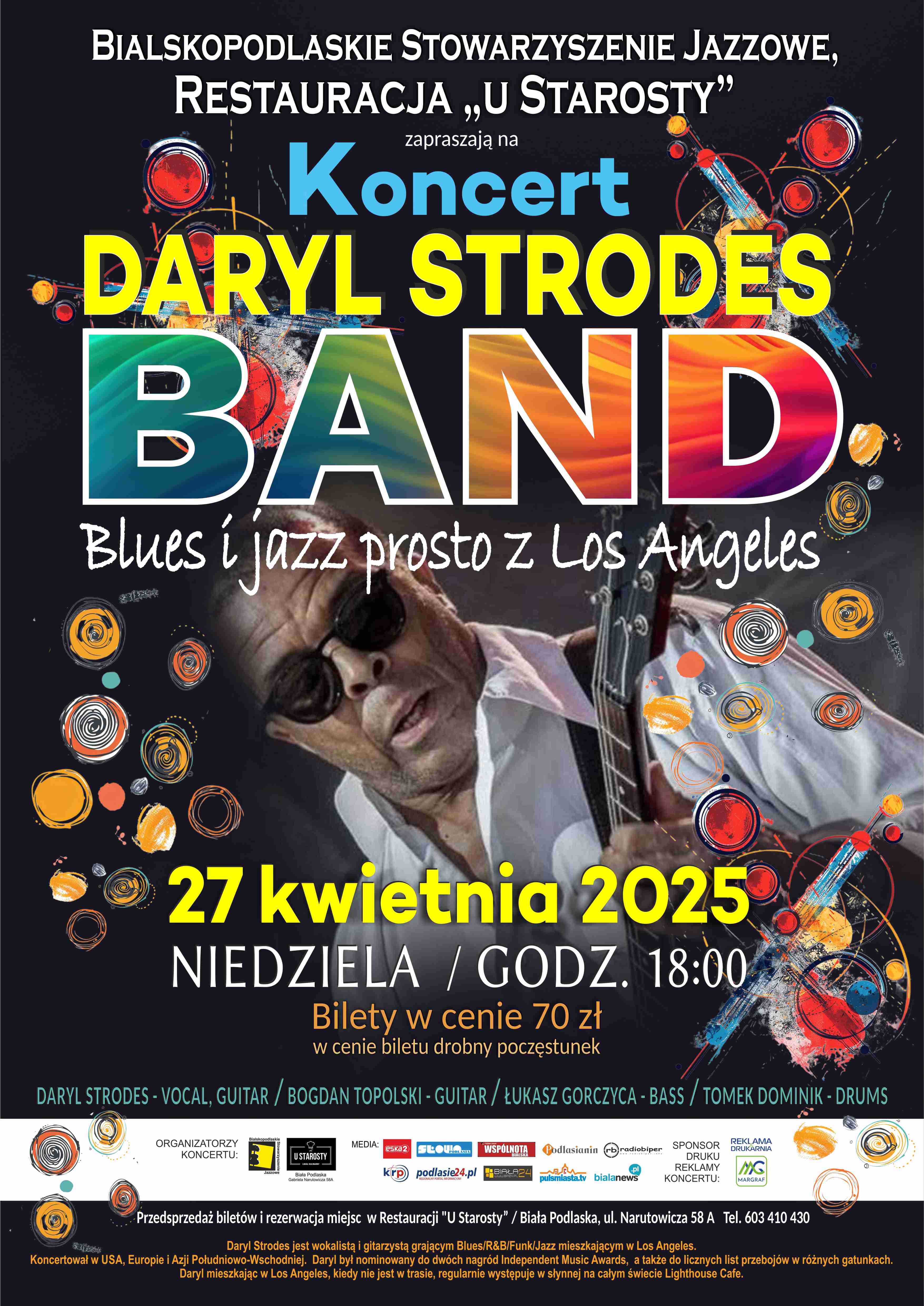 Bialskopodlaskie Stowarzyszenie Jazzowe wraz z Restauracją "U Starosty" zapraszają na wyjątkowy koncert – Daryl Strodes Band. Wystąpi wyśmienity gitarzysta i wokalista bluesowy z Los Angeles, Daryl Strodes, który dwukrotnie nominowany był do Nagrody Independent Music Awards.