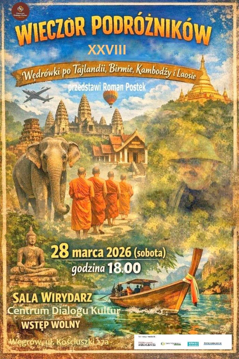 Kilka godzin później, o godzinie 18.00, odbędzie się inne cykliczne spotkanie: „Wieczór podróżników”. Wędrówki po Dalekim Wschodzie opisze i zilustruje Roman Postek. Trasa niezwykle egzotyczna: Tajlandia, Birma, Laos i Kambodża.