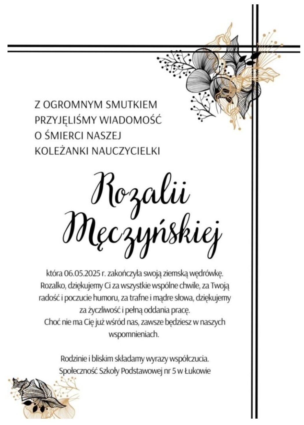 Była cenioną pedagog, znaną z życzliwości i poczucia humoru. 6 maja, po ciężkiej chorobie, zmarła Rozalia Męczyńska – nauczyciel języka angielskiego w Szkole Podstawowej nr 5 w Łukowie.