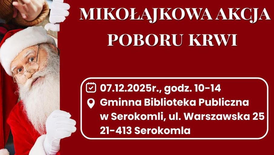 Mikołajkową Akcję Poboru Krwi organizują wspólnie Regionalne Centrum Krwiodawstwa i Krwiolecznictwa w Lublinie oraz łukowski klub Honorowych dawców Krwi „Ostoja”. Partnerami wydarzania są Gminna Biblioteka Publiczna w Serokomli, Urząd Gminy oraz druhowie strażacy z Serokomli. Ambulans, w którym będzie oddawana krew, stanie przy budynku biblioteki.Krew mogą oddać osoby, które mają od 18 do 65 lat i ważą co najmniej 50 kilogramów. W dniu oddania krwi należy być wyspanym i wypoczętym oraz zdrowym, czyli nie mieć objawów przeziębienia i nie brać aktualnie żadnych leków. Trzeba zjeść lekki, niskotłuszczowy posiłek, a w ciągu doby przed pobraniem wypić około 2 litrów płynów. Przychodząc na akcję trzeba wziąć ze sobą dokument tożsamości ze zdjęciem, najlepiej dowód osobisty.