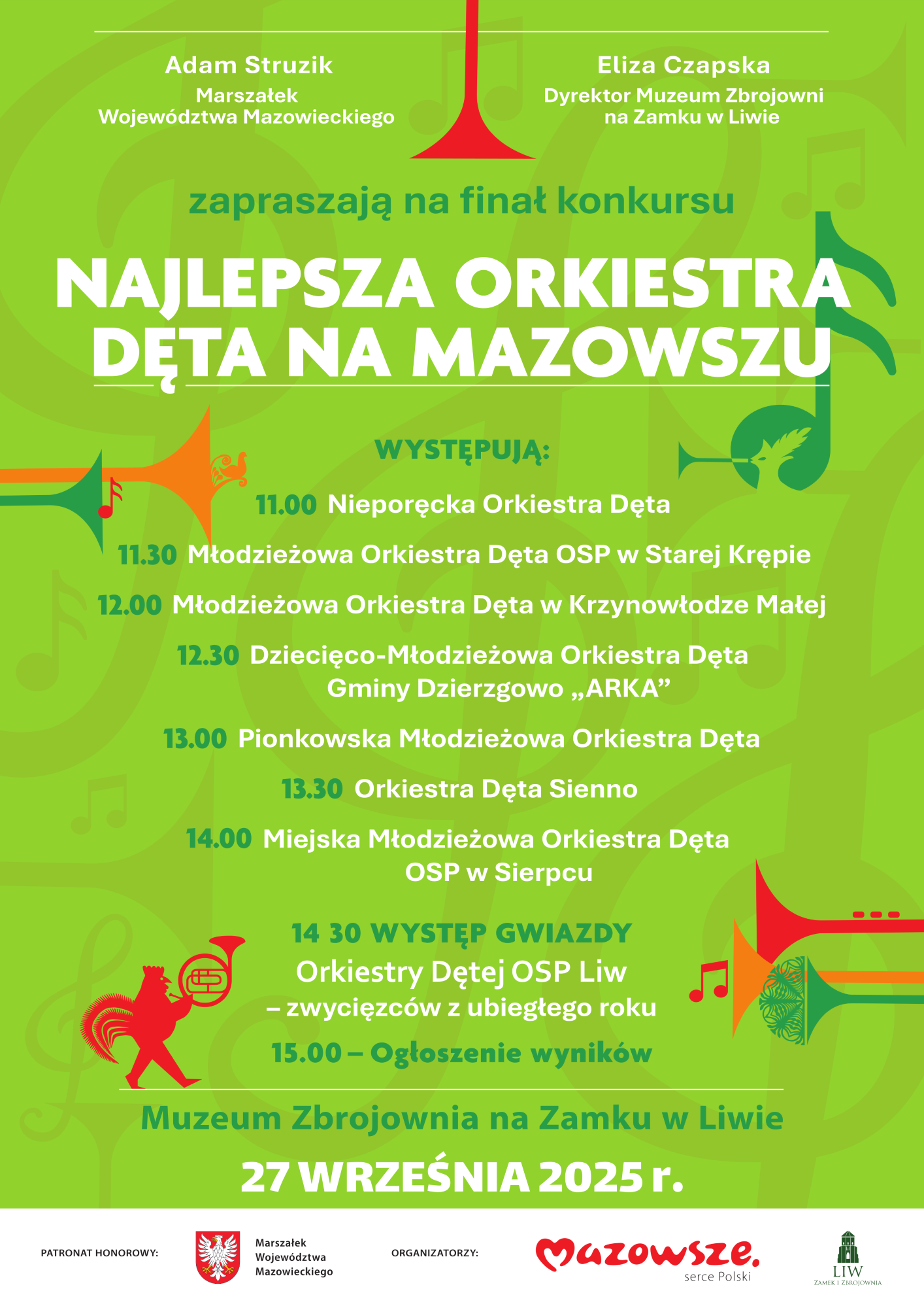 Finał XII konkursu "Najlepsza Orkiestra Dęta na Mazowszu" odbędzie się w sobotę, 27 września w Muzeum Zbrojowni na Zamku w Liwie. O tytuł najlepszej orkiestry na Mazowszu będą walczyły zespoły z całego województwa reprezentujące różne środowiska i kategorie wiekowe.