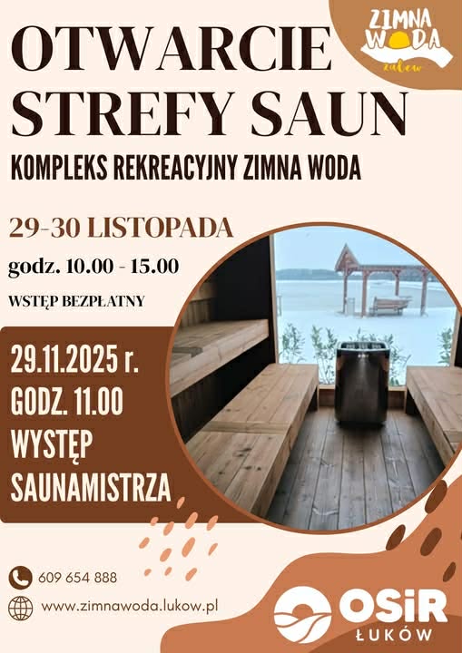 W najbliższy weekend, 29–30 listopada, nad zalewem Zimna Woda w Łukowie odbędzie się otwarcie strefy saun – pierwszych ogólnodostępnych saun w regionie. Inwestycja została zrealizowana w ramach zwycięskiego projektu Łukowskiego Budżetu Obywatelskiego z ubiegłego roku.Strefa saun będzie dostępna w sobotę i niedzielę w godzinach 10:00–15:00. Regularne korzystanie z saun będzie płatne, ale otwarcie strefy w ten weekend stanowi okazję, by bez opłat zapoznać się z nową atrakcją.