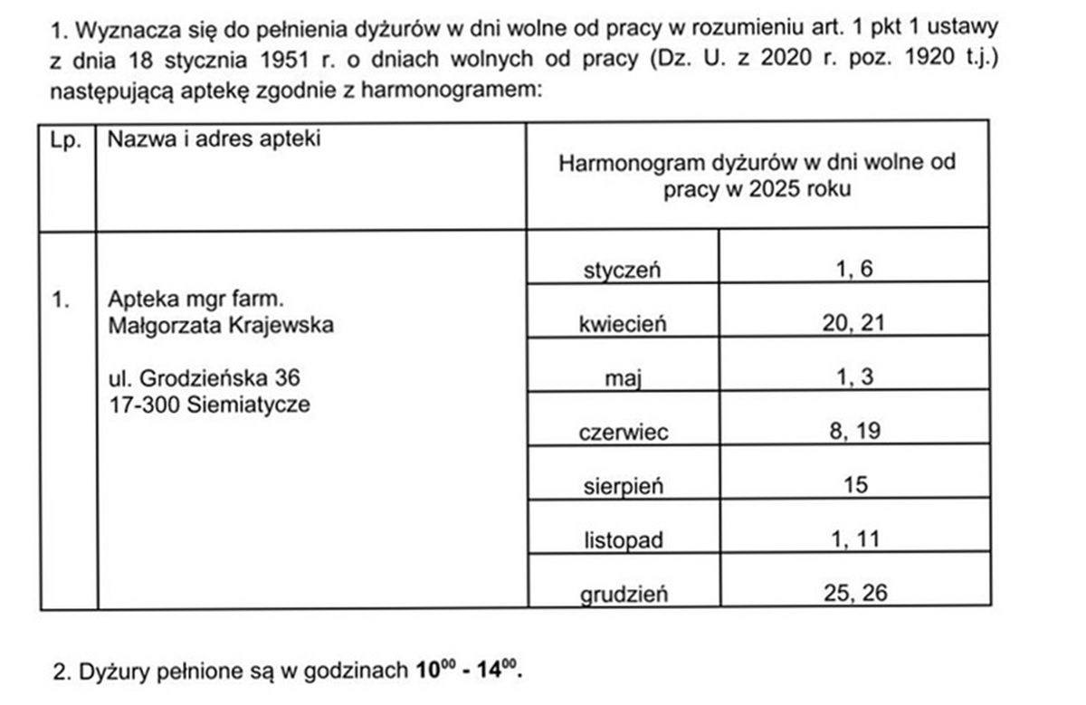 Zgodnie z najnowszymi ustaleniami, a więc uchwałą Zarządu Powiatu Siemiatyckiego, na terenie powiatu od 1 stycznia do 31 grudnia 2025 roku, dyżury apteczne – w dni wolne od pracy (zgodnie z art. 1 pkt 1 ustawy z dnia 18 stycznia 1951 r. o dniach wolnych od pracy) będzie pełniła jedna apteka. Wymieniona w dokumencie Apteka mgr farm. Małgorzata Krajewska ul. Grodzieńska 36 w Siemiatyczach dyżurować będzie w godz. 10.00 – 14.00.Dyżur ten dotyczy tylko 13 dni w roku: Nowy Rok i Święto Trzech Króli, Wielkanoc, 1 i 3 maja, Boże Ciało, 15 sierpnia, 1 i 11 listopada oraz Boże Narodzenie.