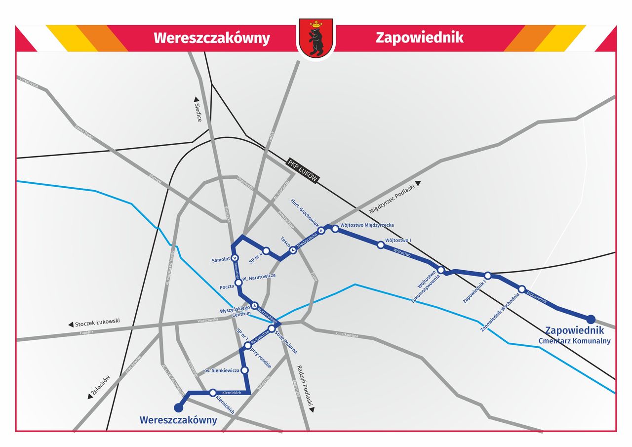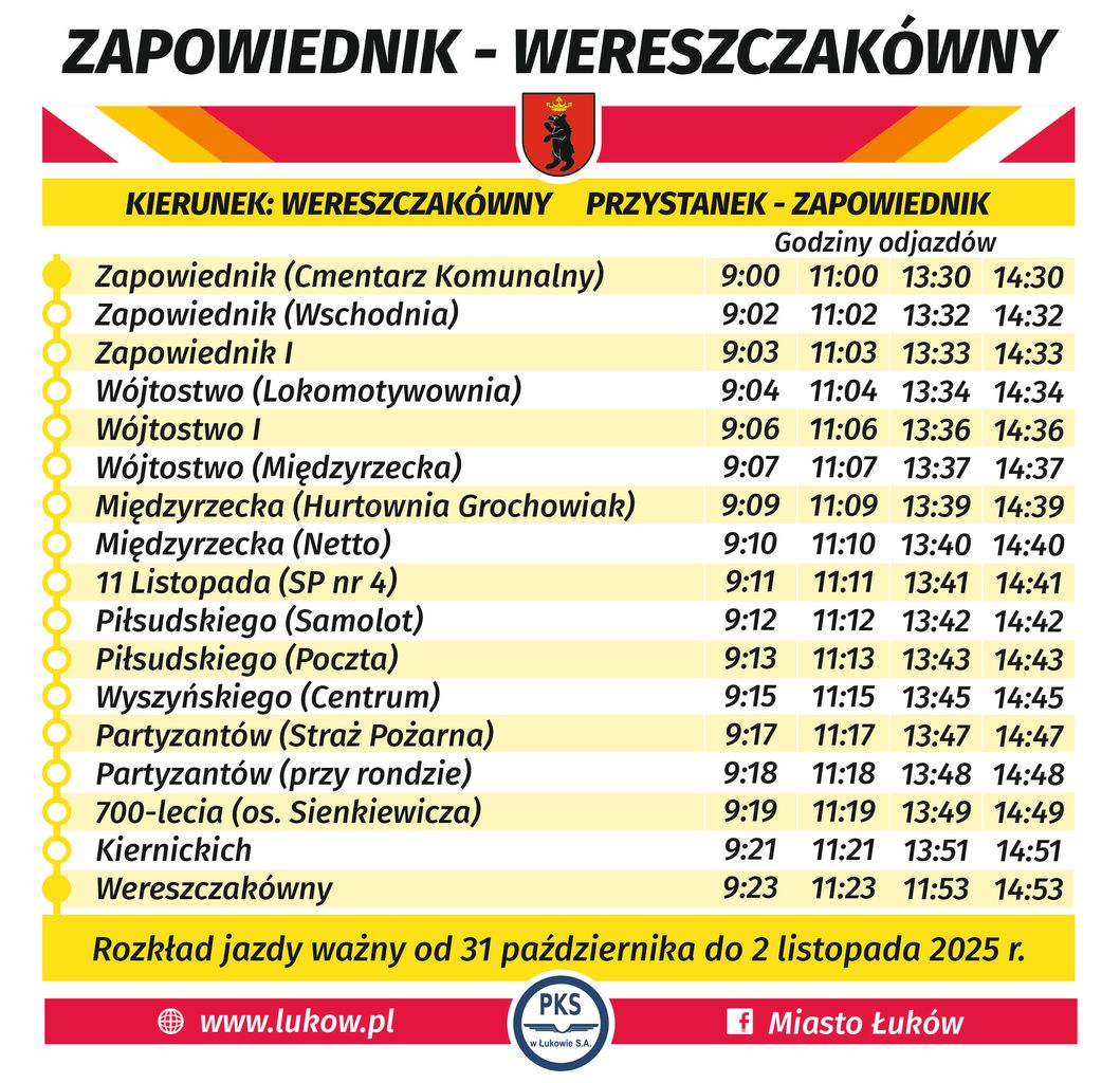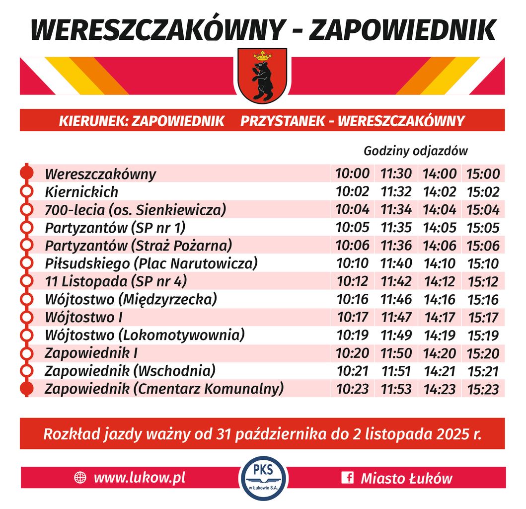 Przewozów tradycyjnie dokonywać będzie spółka PKS w Łukowie S.A., a autobusy przewoźnika kursować będą po ulicach Wereszczakówny, Kiernickich, 700-lecia, Partyzantów, Wyszyńskiego, Piłsudskiego 11 Listopada, Międzyrzeckiej, Wójtostwo i Zapowiednik. - Dzięki tej linii mieszkańcy będą mieli możliwość pozostawienia własnych samochodów i wybrania podróży na cmentarze innym środkiem transportu. Linia to także wyjściem naprzeciw dla osób starszych, mających ograniczoną możliwość poruszania się lub nieposiadających samochodu lub innego środka transportu. – czytamy w informacji z łukowskiego magistratu.Krańcowe przystanki specjalnej linii autobusowej wyznaczono na ul. Wereszczakówny (przystanek w pobliżu kościoła Brata Alberta) oraz na ul. Zapowiednik w sąsiedztwie cmentarza komunalnego. Ponadto w piątek 31 października standardowo będzie kursować linia Ł4.